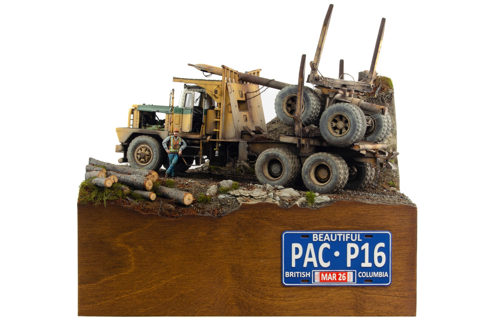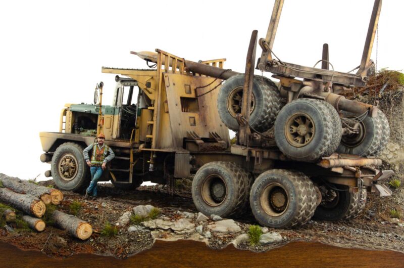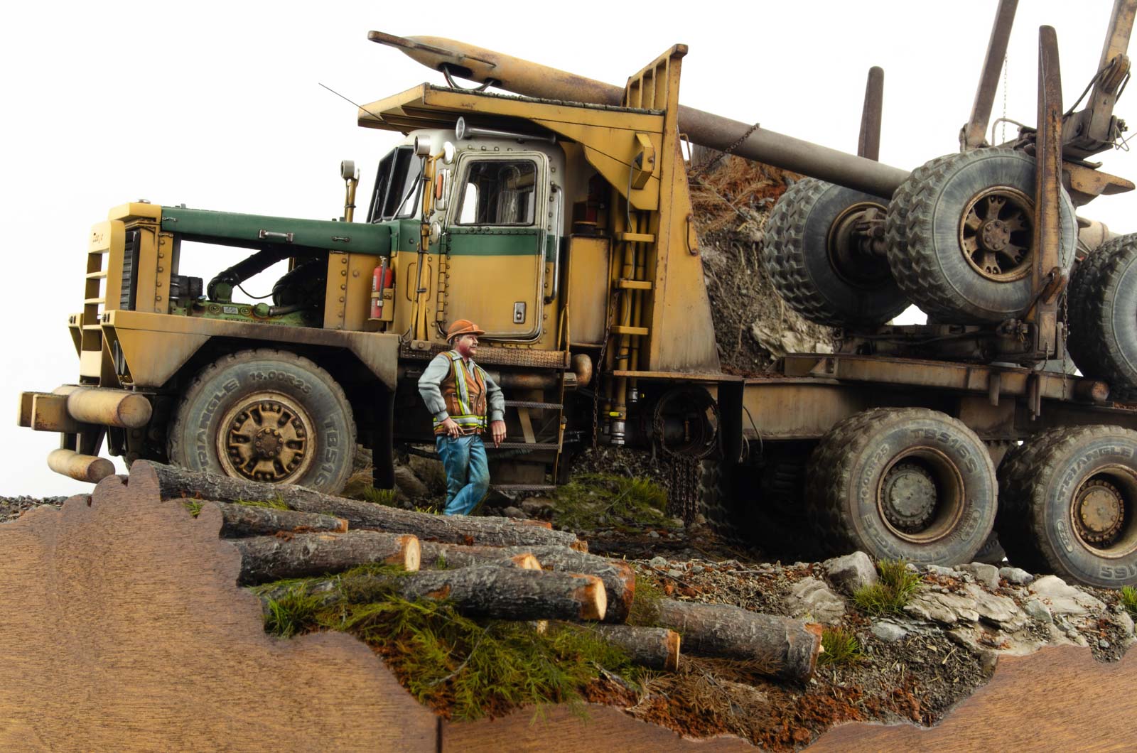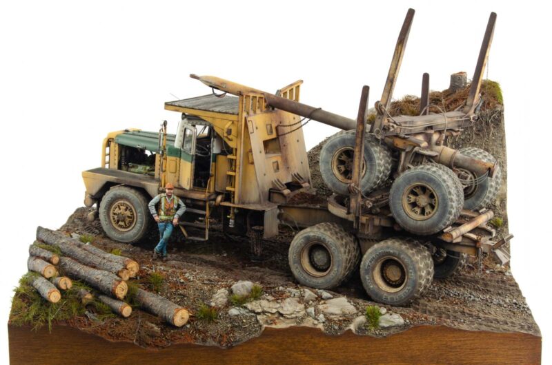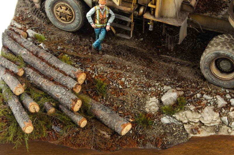 I wanted to add as many visual clues into the scene as possible. Starting with the height of the diorama that enhances the feeling of elevation, to fresh wood shavings and bark chips littering the ground. Just as with the truck itself, reference images were extremely helpful during the entire creative process.